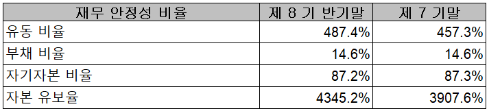 2021년 상반기 말 기준 재무안정성 비율에서는 유동비율 487.4%, 부채비율 14.6%, 자기자본비율 87.2%, 자본유보율 4,345.2%를 기록하면서 풍부한 유동성과 함께 건실하고 안정적인 재무상태를 유지하고 있습니다.