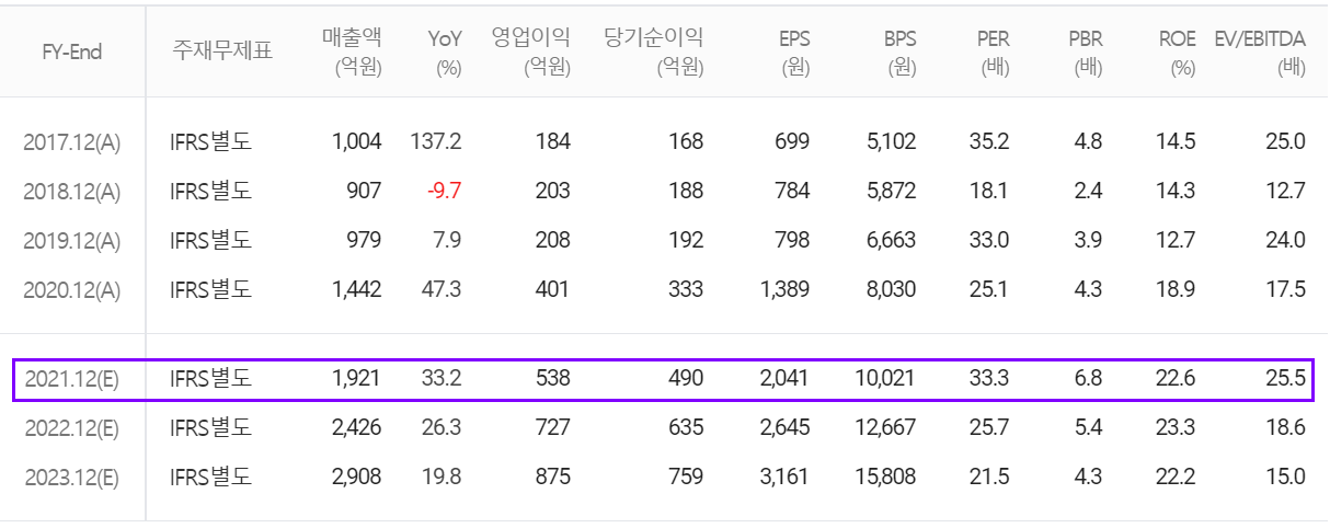 2021년 예상실적은 매출액 1,921억 원으로 전년 대비 33.2% 증가하고, 영업이익은 538억 원으로 34.2% 증가할것으로 추정했습니다. 삼성전자 갤럭시 Z폴드 3, Z플립 3 등의 수요가 급증하고 아이폰 13의 출시에 따라 꾸준한 수요 증가가 예상되며, OLED 닌텐도 출시 및 OLED 노트북 증가에 따른 소재 수요 증가도 당분간 지속될 전망입니다.