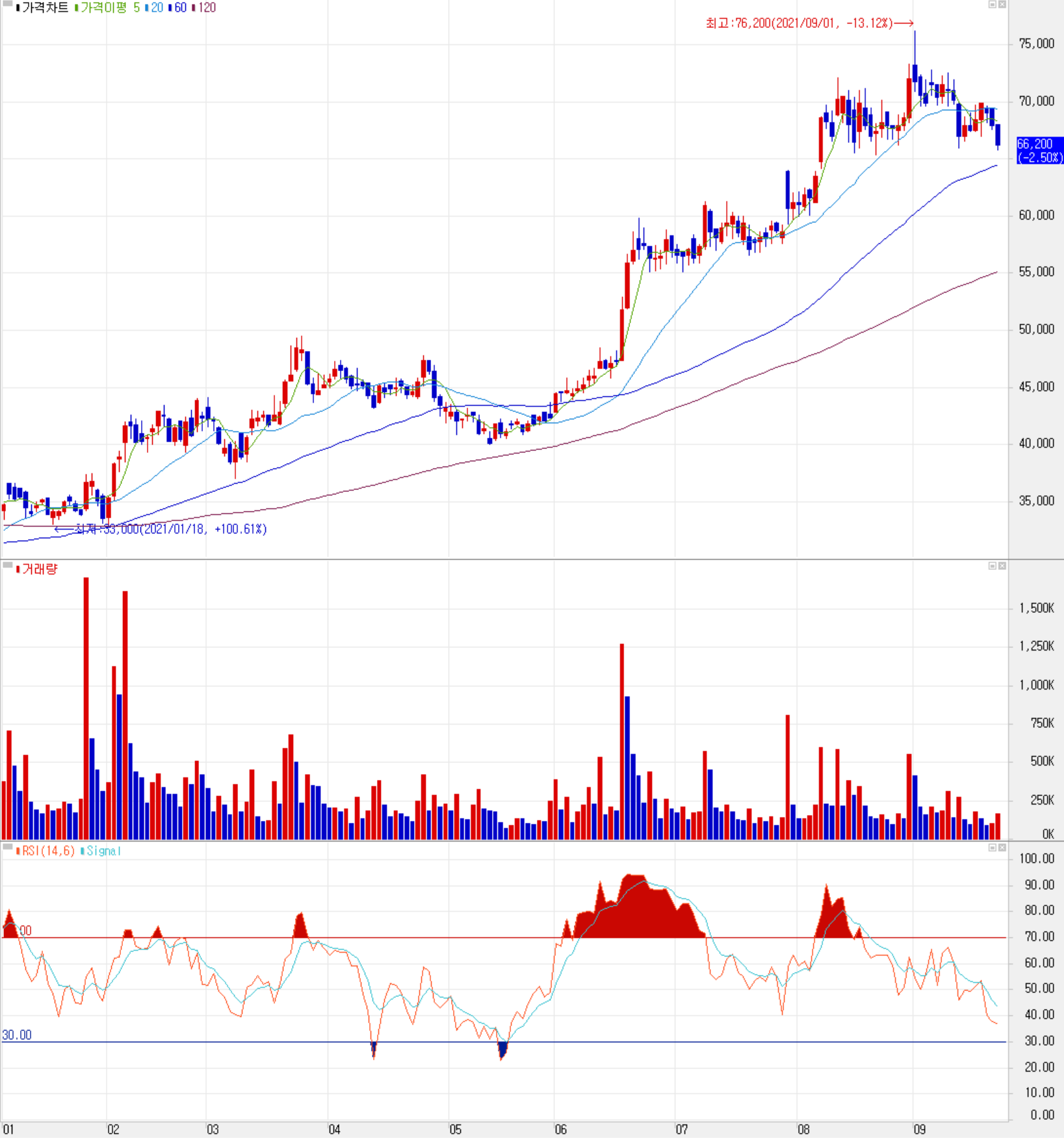 9월 27일 장 종료 기준 당사의 주가는 전 거래일보다 2.5% 내린 66,200원에 거래를 마쳤습니다. 외국인비중은 17.18%이며, 시가총액 1조 5,895억 원으로 코스닥 시총 기준 32위 종목입니다.