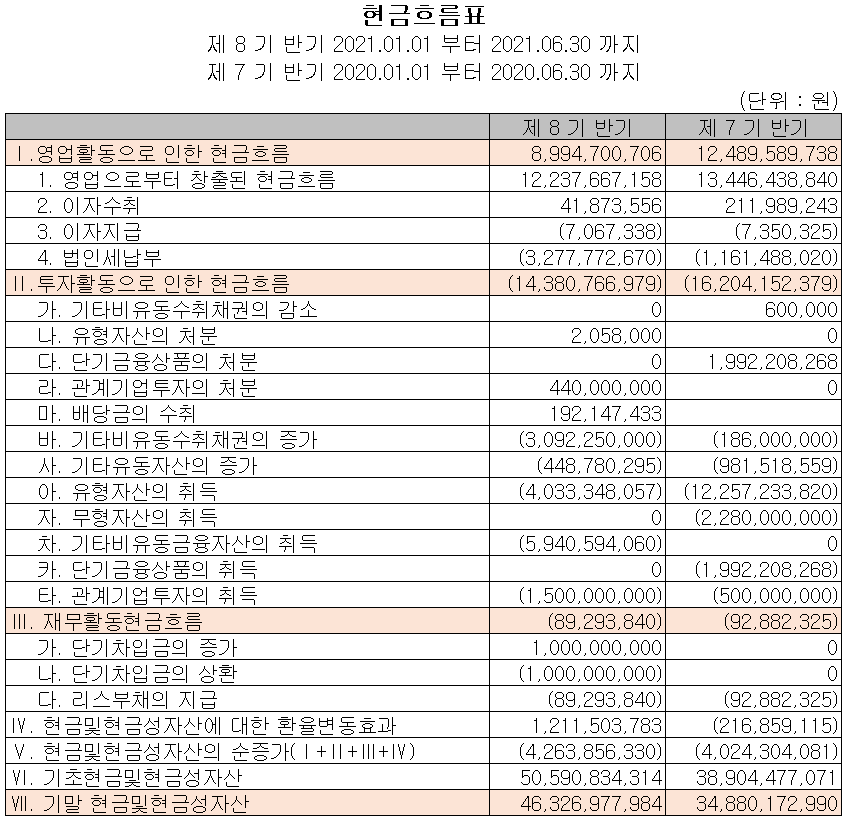 지난 상반기 영업활동 현금흐름에서는 90억 원의 현금이 유입되었으며, 투자활동에서는 유형자산의 취득 및 기타비유동수취채권의 증가로 144억 원의 현금이 유출되었습니다. 재무활동 현금흐름에서는 차입금을 조달하여 당기 부채를 상환하였습니다. 2021년 상반기 말 기준 현금 및 현금성 자산은 전년 동기 말보다 114억 원이 증가한 463억 원을 보유하고 있습니다.