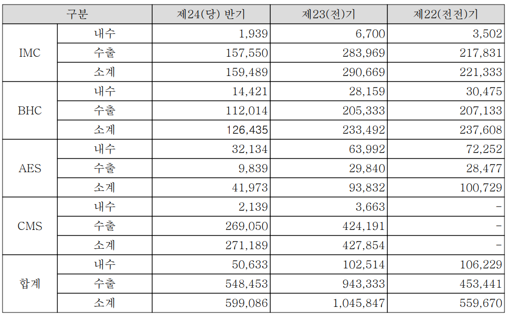 당사와 종속회사가 영위하는 사업부문은 스마트폰 및 주변기기에 사용되는 PBA(인쇄회로기판) 모듈을 공급하는 IMC 부문, 지문인식센서 등 전통 IT 기술과 생체 인식 모듈이 접목된 BHC 부문, 자동차 전장 부푸 및 광학 센서류 등을 개발하는 AES 부문 그리고 스마트폰, 자율주행 등에 적용되는 카메라 모듈을 생산하는 CMS 부문으로 구성되어 있습니다. 지난 상반기 IMC 부문의 매출은 1,595억 원으로 전체 매출의 26.6%를 차지하였으며, BHC 부문 매출은 1,264억 원으로 21.1%, CMS 사업부문은 2,712억 원으로 45.3%의 매출 비중을 기록했습니다. 상반기 전체 매출 중 내수는 506억 원으로 8.45%, 수출은 5,485억 원으로 91.55%의 매출 비중을 나타냈습니다.