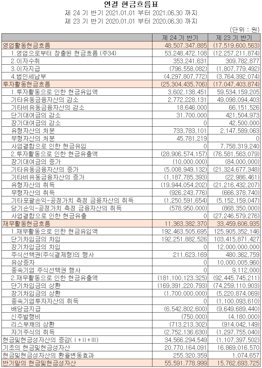 2021년 상반기 영업활동 현금흐름에서는 485억 원의 현금이 유입되었으며, 투자활동에서는 유무형 자산의 취득 및 금융자산의 증가로 253억 원의 현금이 유입되었습니다. 재무활동에서는 차입금을 조달하여 당기 부채를 상환하고, 배당금을 지급 및 자기 주식의 취득이 있었습니다. 2021년 상반기 말 기준 현금 및 현금성 자산은 전기 말 대비 398억 원이 늘어나면서 556억 원을 보유하고 있습니다.