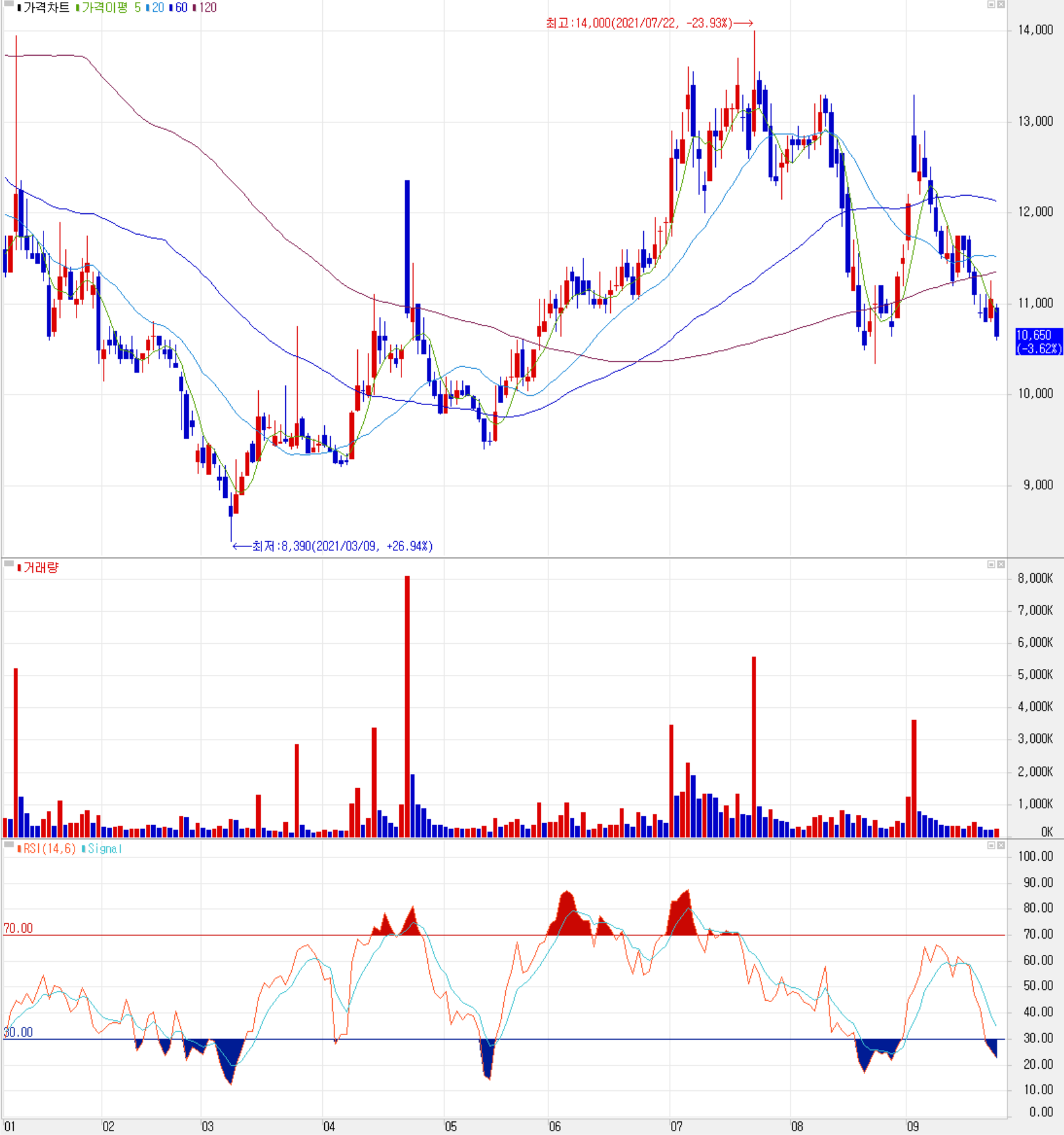 9월 28일 장 종료 기준 당사의 주가는 전일보다 3.62% 내린 10,650원에 거래를 마감했습니다. 외국인 비중은 20.74%이며, 시가 총액은 6,954억 원으로 코스피 시총 기준 306위 종목입니다.