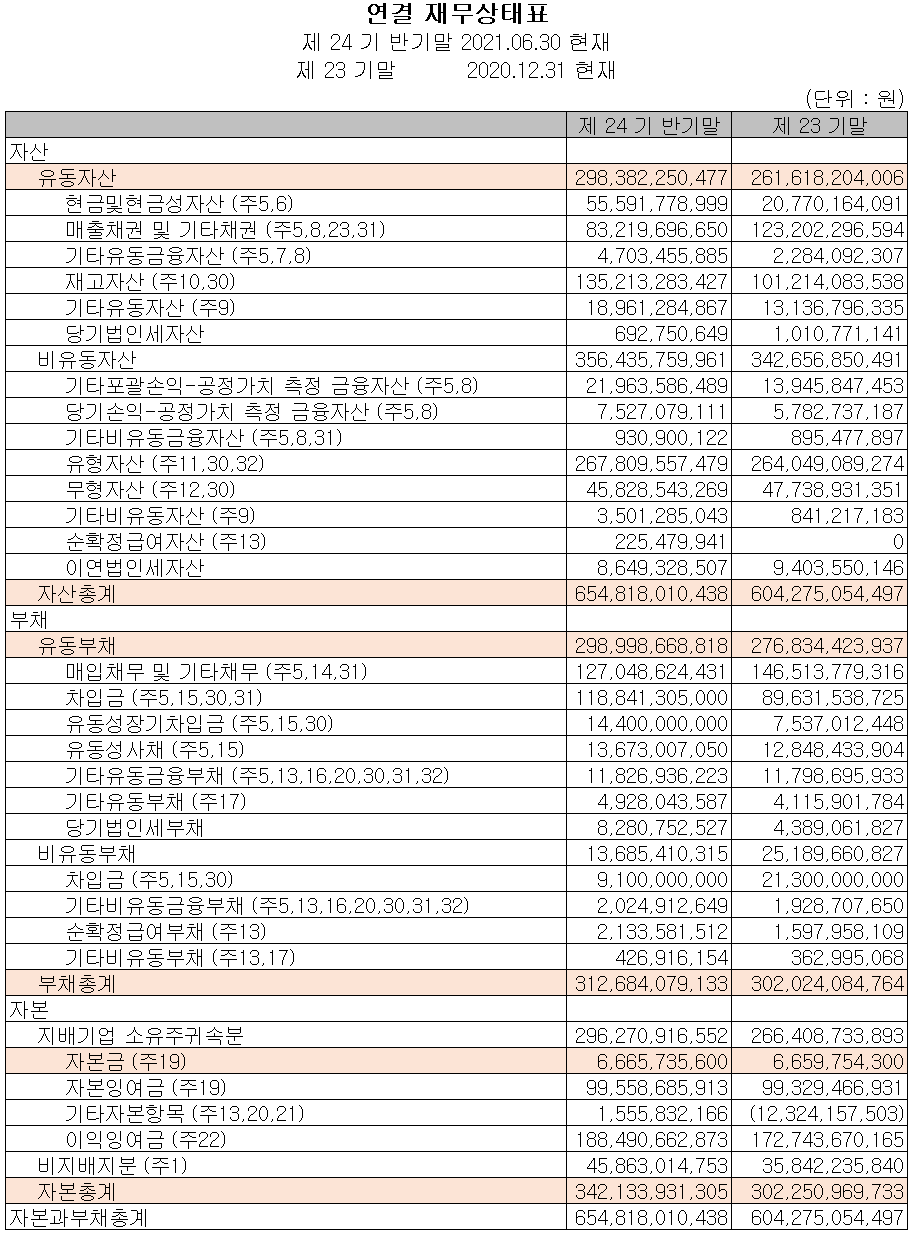 2021년 상반기 말 현재 자산총계는 전기 말보다 8.4% 증가한 6,548억 원으로 현금 및 현금성 자산과 재고 자산의 증가에 기인합니다. 부채총계는 3.5% 늘어난 3,127억 원으로 유동성 장기 차입금의 증가에 따릅니다. 자본총계는 이익의 증가 등으로 399억 원이 늘어난 3,421억 원을 기록했습니다.