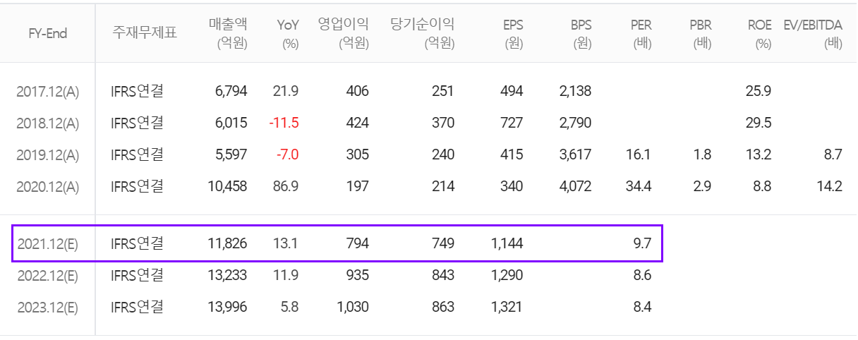 2021년 연간 예상실적에서는 매출액 1조 1,826억 원으로 전년 대비 13.1% 증가하고, 영업이익은 794억 원으로 303% 증가할것으로 추정했습니다. 카메라 모듈 사업의 성장과 의료기기 등의 성장이 당분간 지속될 것으로 전망합니다.