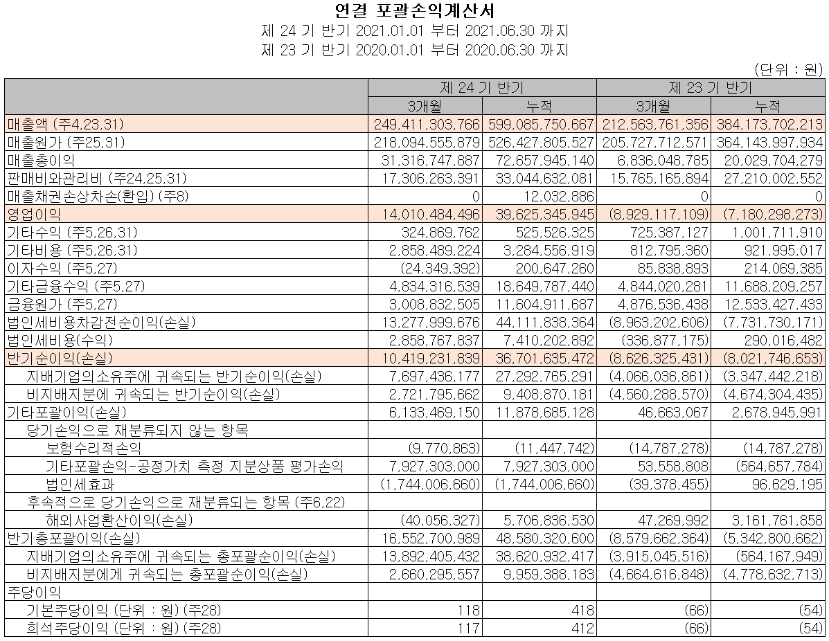 지난 2분기 당사의 실적은 매출액 2,494억 원으로 전년 동기 대비 17.3% 증가했고, 영업이익은 140억 원, 당기순이익은 104억 원으로 흑자 전환했습니다. 지난해 2월 (주)나무가의 최대주주가 되면서 CMS 사업을 편입하였고, 관련 사업에서의 매출 증가세로 전반적인 상반기 실적을 견인했습니다.