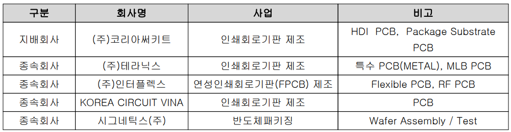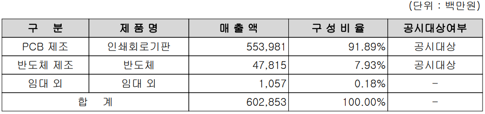 당사와 종속회사의 사업부문은 당사의 주력 사업인 인쇄회로기판의 제조, (주)인터플렉스를 통한 연성회로기판(FPCB)의 제조 등을 운영하는 PCB 제조 사업부문 그리고 종속회사 시그네틱스(주)가 주력으로 하는 반도체 패키징 사업부문으로 구성되어 있습니다.