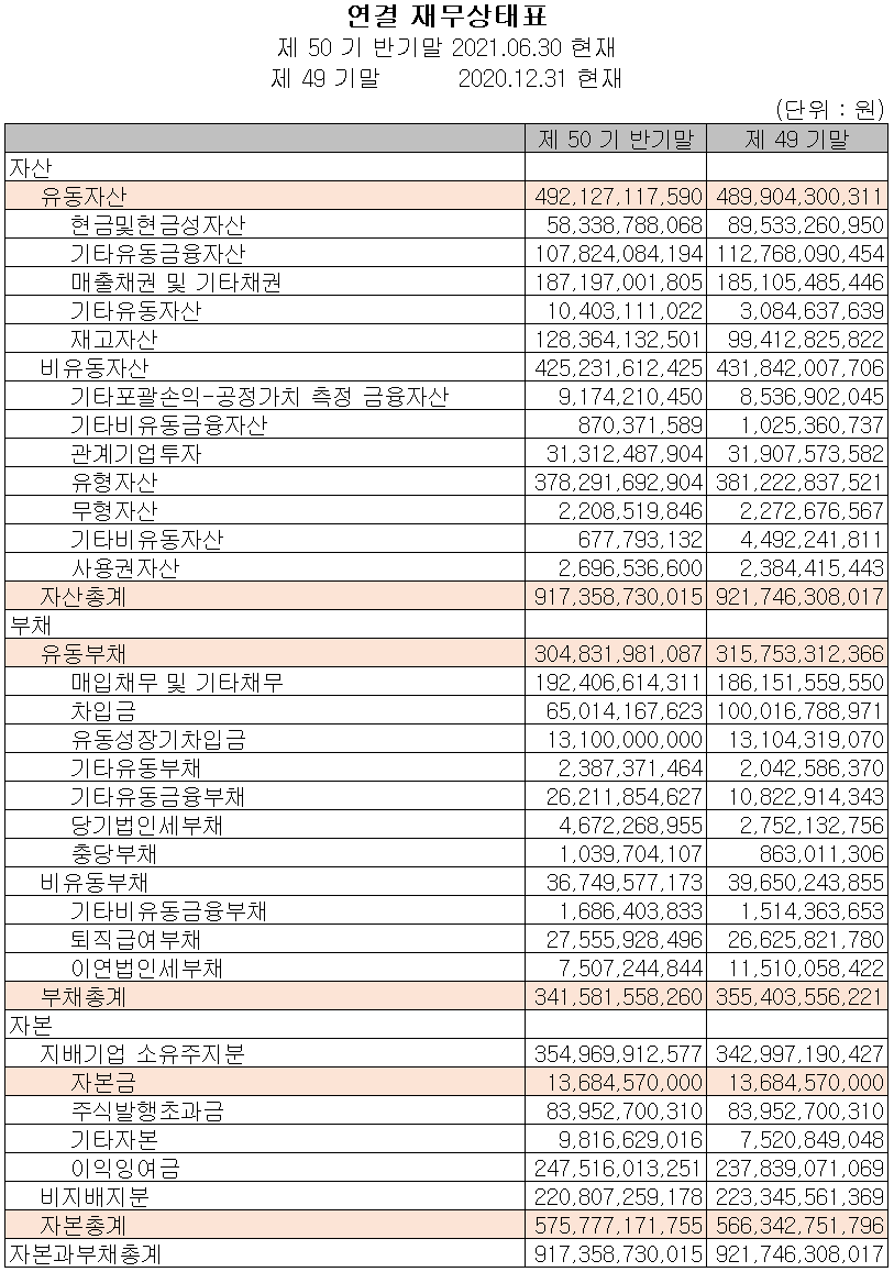 2021년 상반기 말 현재 자산총계는 전기 말보다 0.5% 줄어든 9,174억 원이며, 부채총계는 3.9% 감소한 3,416억 원입니다. 자본총계는 2020년 하반기 대비 늘어난 이익 등으로 94억 원이 증가한 5,758억 원을 기록했습니다.