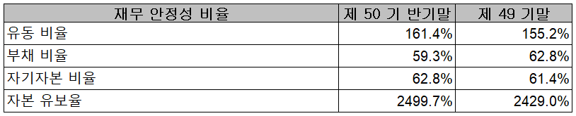2021년 상반기 말 기준 재무 안정성 비율에서는 유동비율 161.4%, 부채비율 59.3%, 자기자본비율 62.8%, 자본유보율 2,499.7%를 기록하면서 양호한 재무상태를 유지하고 있습니다.