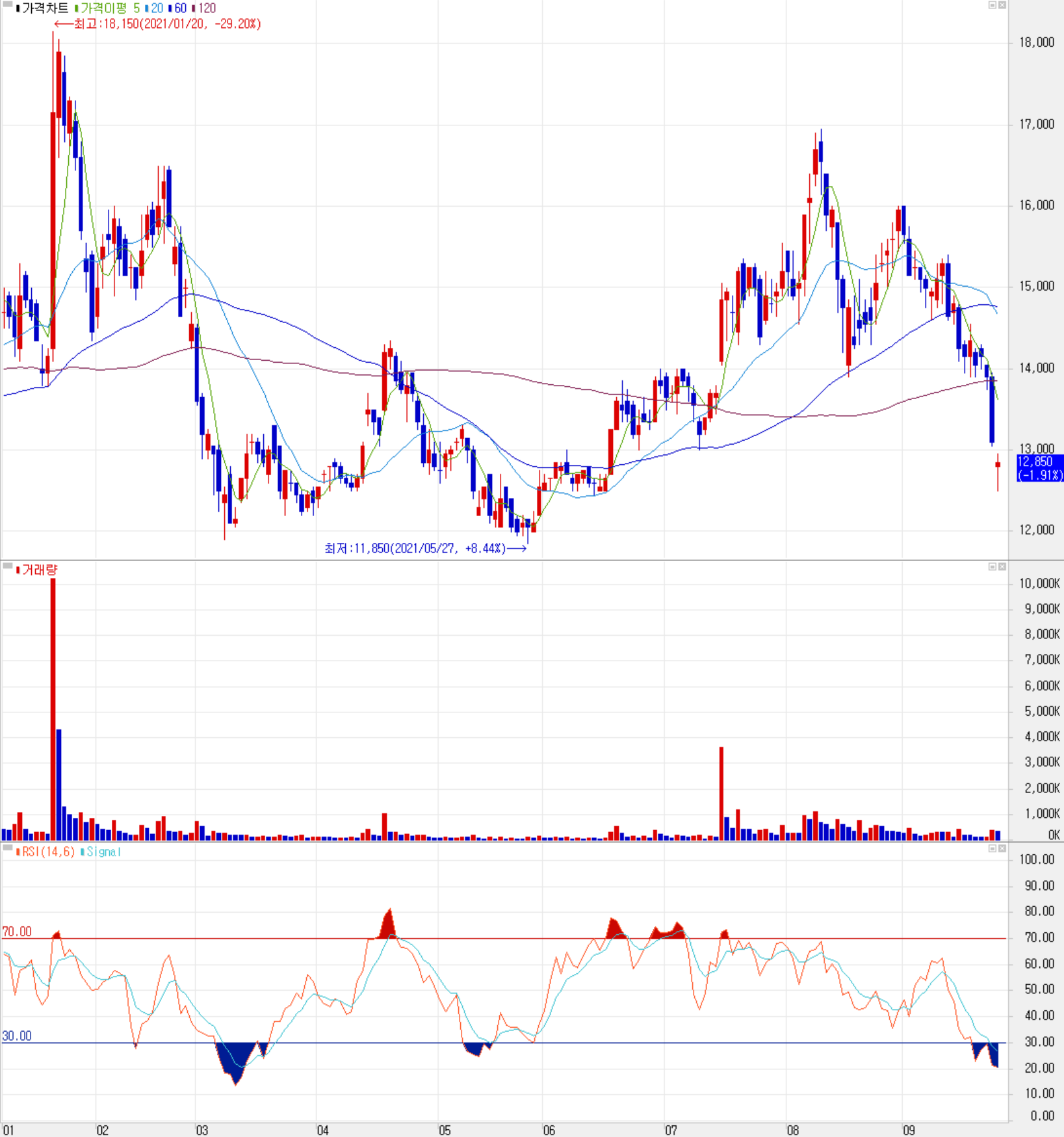 최근 당사의 주가는 하반기 밝은 실적 전망에도 불구하고 인플레이션 우려 등 시장 외적인 변동성으로 하락세를 면치 못하고 있습니다. 최근 수급에서는 연기금을 위시한 기관의 매도에 개인이 물량을 소화하는 모습입니다. 예상실적 및 차트 소견을 종합한 개인적인 목표주가는 17,500원으로 설정하였으나 최근 시장 외적인 불확실성을 좀 더 확인하면서 저점 확인 후 진입을 시도할 예정입니다.