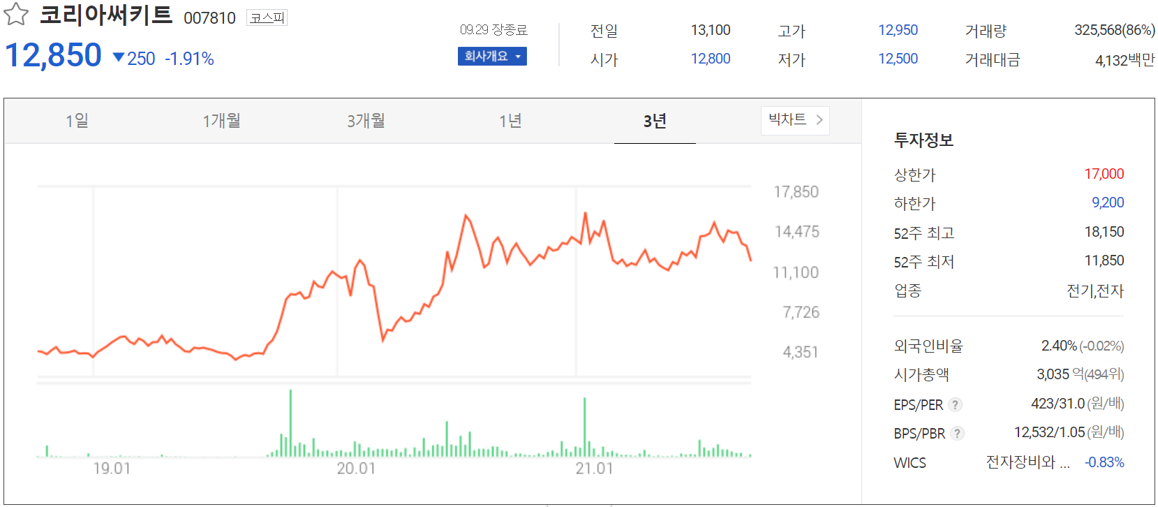 9월 29일 장 종료 기준 당사의 주가는 전일보다 1.91% 내린 12,850원에 거래를 마쳤습니다. 외국인 비중은 2.4%이며, 시가 총액 3,035억 원으로 코스피 시총 기준 494위 종목입니다.