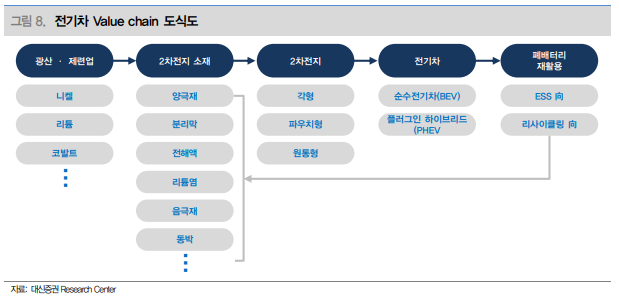아래 대신증권 리서치 센터의 전기차 밸류체인 도식을 참고하면, 원료 니켈, 리튬, 코발트 등을 채굴하는 광산/제련업에서 위에서 설명했던 양극재 음극재등의 2차전지 제조를 위한 다양한 소재산업 그리고 완성차인 전기차를 거쳐서 오래 사용한 배터리를 활용하는 폐배터리 재활용 산업등이 있습니다.