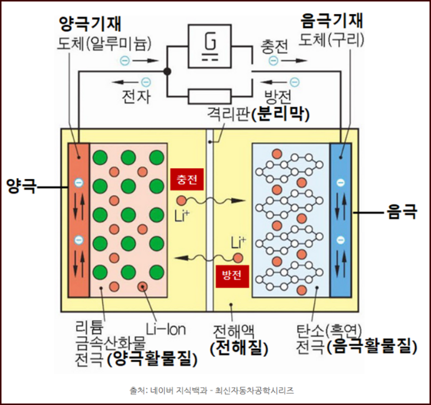 양극에서 충전된 리튬이온을 저장했다가 방출하면서 전기가 흐르게 하는 역할을 합니다.
