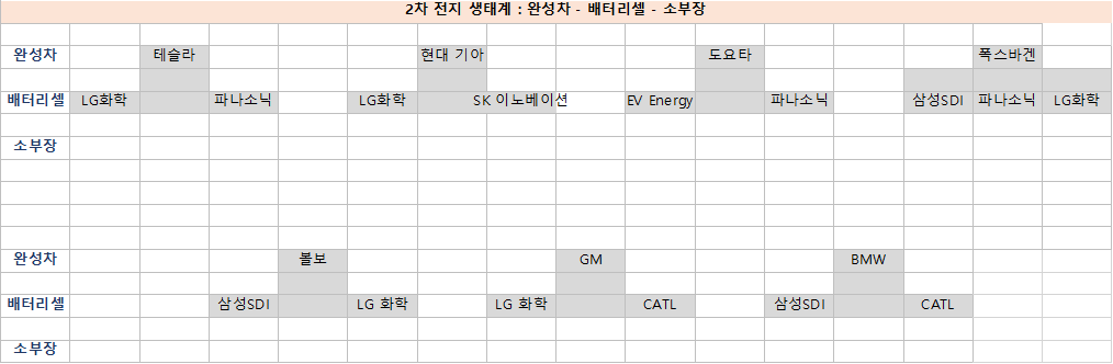 먼저 상기 그림에서 보시면 주요 완성차 업체와 배터리 공급 업체의 생태계를 한 눈에 보실 수 있습니다.