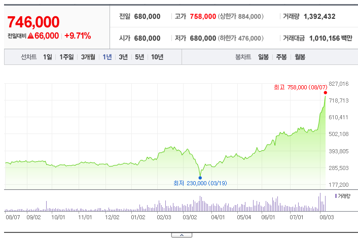 8월 들어서면서 주가가 상승랠리를 이어가고 있습니다. 지난주 금요일 종가는 746,000원으로 마감되었습니다.
