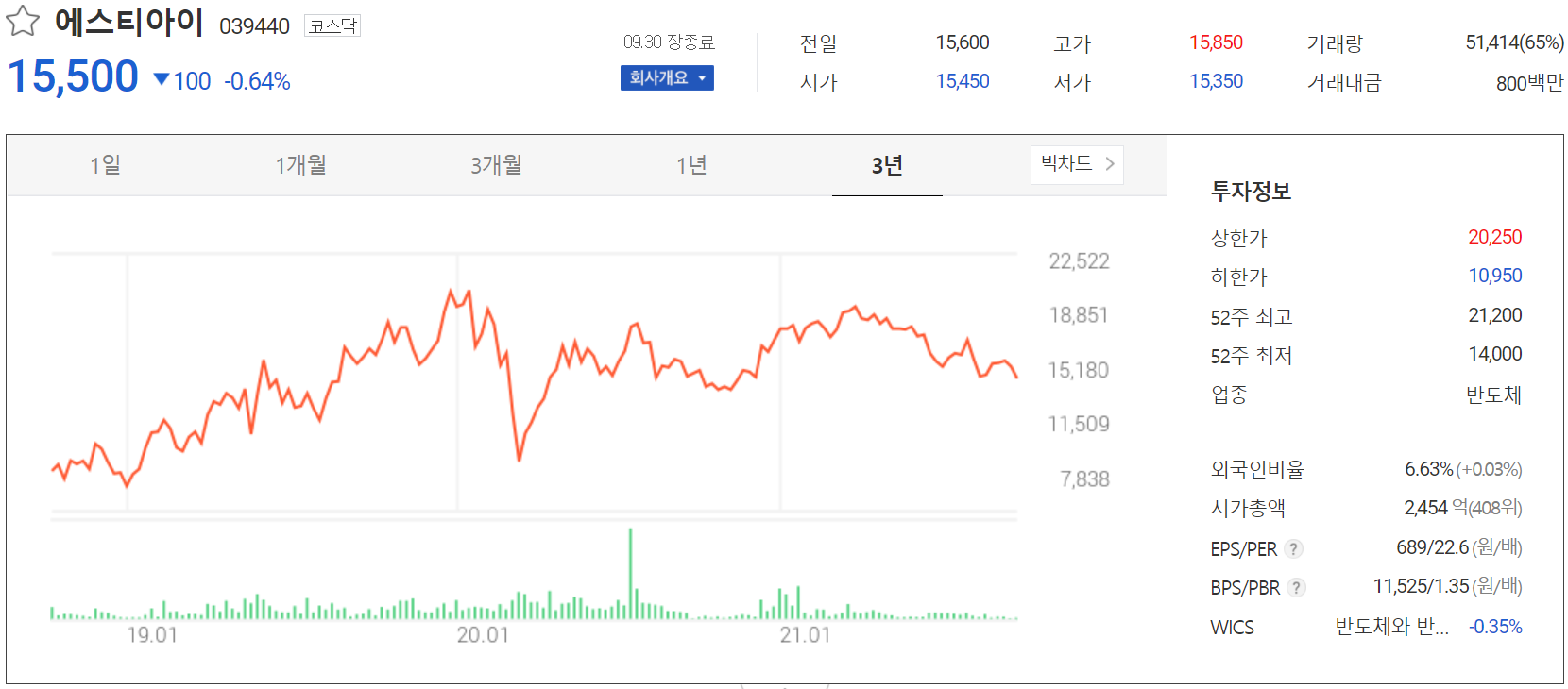 9월 30일 장 종료 기준 당사의 주가는 전일보다 0.64% 내린 15,500원에 거래를 마쳤습니다. 외국인 비율은 6.63%이며, 시가 총액 2,454억 원으로 코스닥 시총 기준 408위 종목입니다.