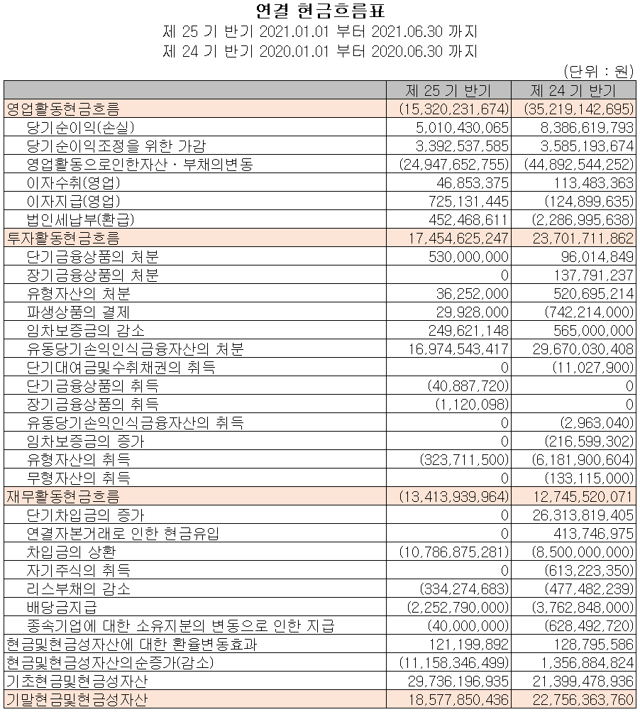 지난 상반기 영업활동 현금흐름에서는 운전자산의 변동에 따라 153억 원의 현금이 유출되었으며, 투자활동에서는 금융자산의 처분으로 175억 원의 현금이 유입되었습니다. 재무활동에서는 당기 부채를 상환하고 배당금을 지급하면서 134억 원의 현금이 유출되었습니다. 2021년 상반기 말 기준 현금 및 현금성 자산은 전년 동기 말보다 42억 원이 줄어든 186억 원을 보유하고 있습니다.