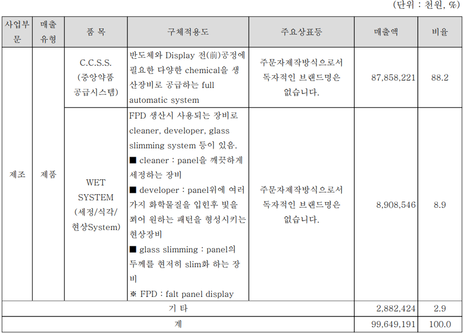 당사는 반도체 제조 공정 상의 케미컬 여과방법 및 장치에 대한 기술로 중앙 약품 공급 시스템(C.C.S.S)과 세정, 식각 및 현상 시스템인 Wet System을 제조, 공급하고 있습니다. 지난 상반기 C.C.S.S의 매출액은 879억 원으로 전체 매출의 88.2%를 차지하였으며, Wet System은 89억 원의 매출로 8.9%를 기록했습니다.