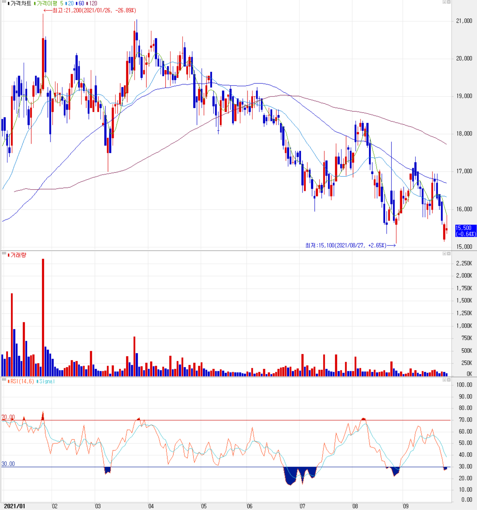 9월 30일 장 종료 기준 당사의 주가는 전일보다 0.64% 내린 15,500원에 거래를 마쳤습니다. 외국인 비율은 6.63%이며, 시가 총액 2,454억 원으로 코스닥 시총 기준 408위 종목입니다.