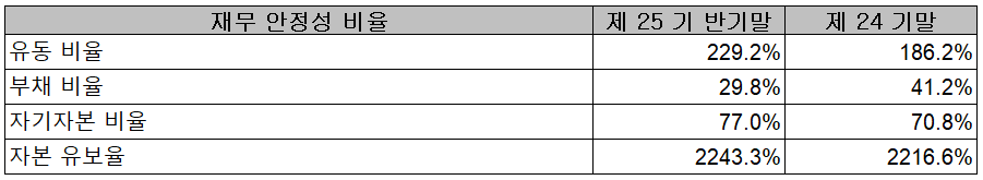 2021년 상반기 말 기준 재무안정성 비율에서는 유동비율 229.2%, 부채비율 29.8%, 자기자본비율 77%, 자본 유보율 2,243.3%를 기록하면서 건실하고, 안정적인 재무상태를 유지하고 있습니다.