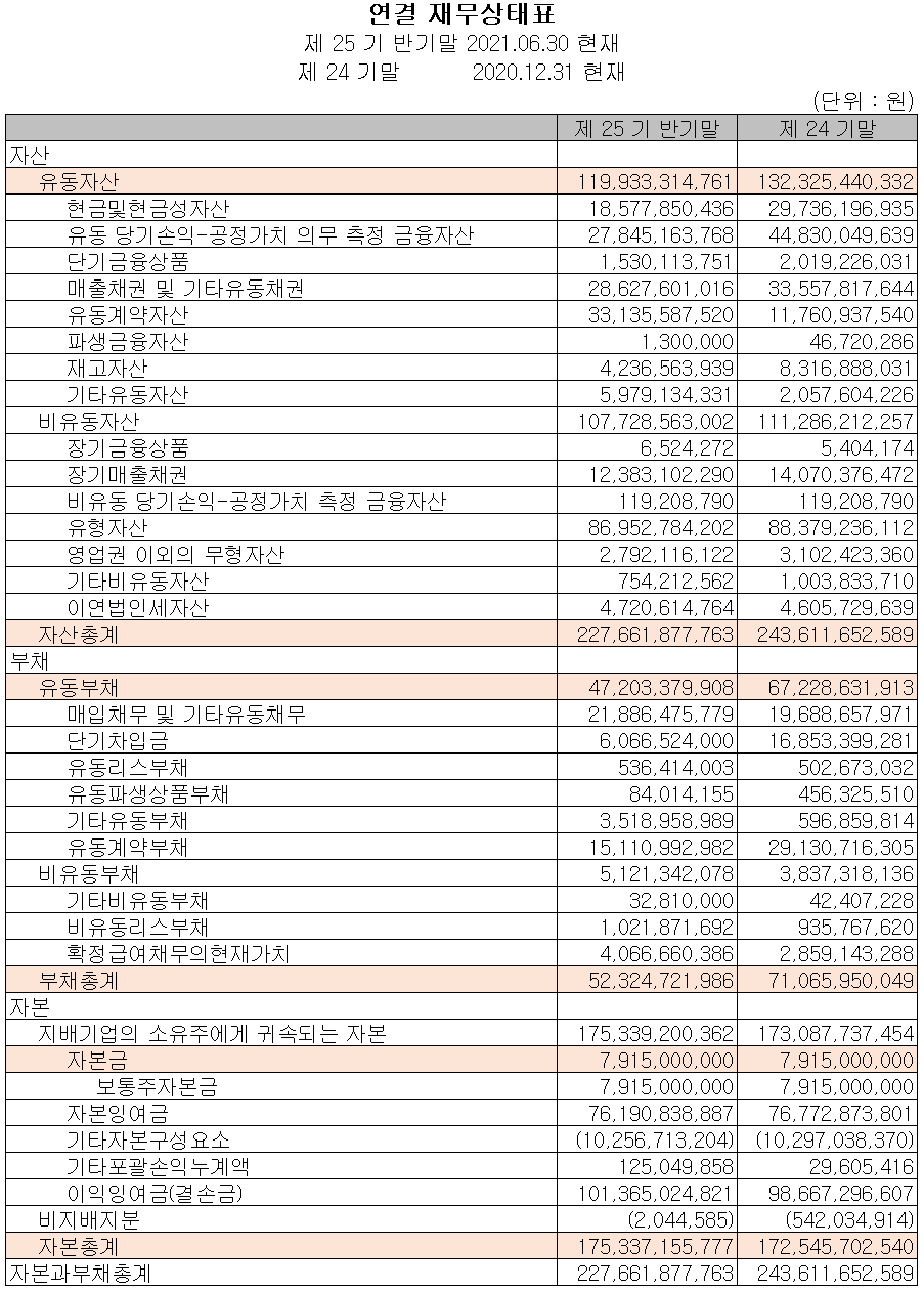 2021년 상반기 말 기준 자산총계는 전기 말보다 6.5% 줄어든 2,277억 원으로 유동당기손익(수익 증권), 매출채권 및 재고자산의 감소 등에 기인합니다. 부채총계는 26.4% 감소한 523억 원으로 단기차입금 및 유동 계약 부채의 감소에 따릅니다.