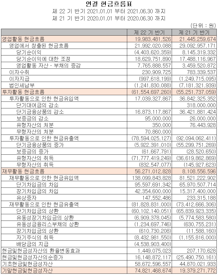 2021년 상반기 영업활동 현금흐름에서는 당기순손실에도 불구하고 비현금 항목의 조정 및 운전자산의 변동에 의해 200억 원의 현금이 유입되었습니다. 투자활동에서는 유형자산의 취득으로 전체 616억 원의 현금이 유출되었습니다. 재무활동에서는 차입금을 차입과 유상증자 등을 통해 자금을 조달하여 당기 부채를 상환하고 자기 주식을 취득하였으며 배당금을 상환하였습니다. 2021년 상반기 말 기준 현금 및 현금성 자산은 전년 동기 말 대비 554억 원이 늘어난 748억 원을 보유하고 있습니다.