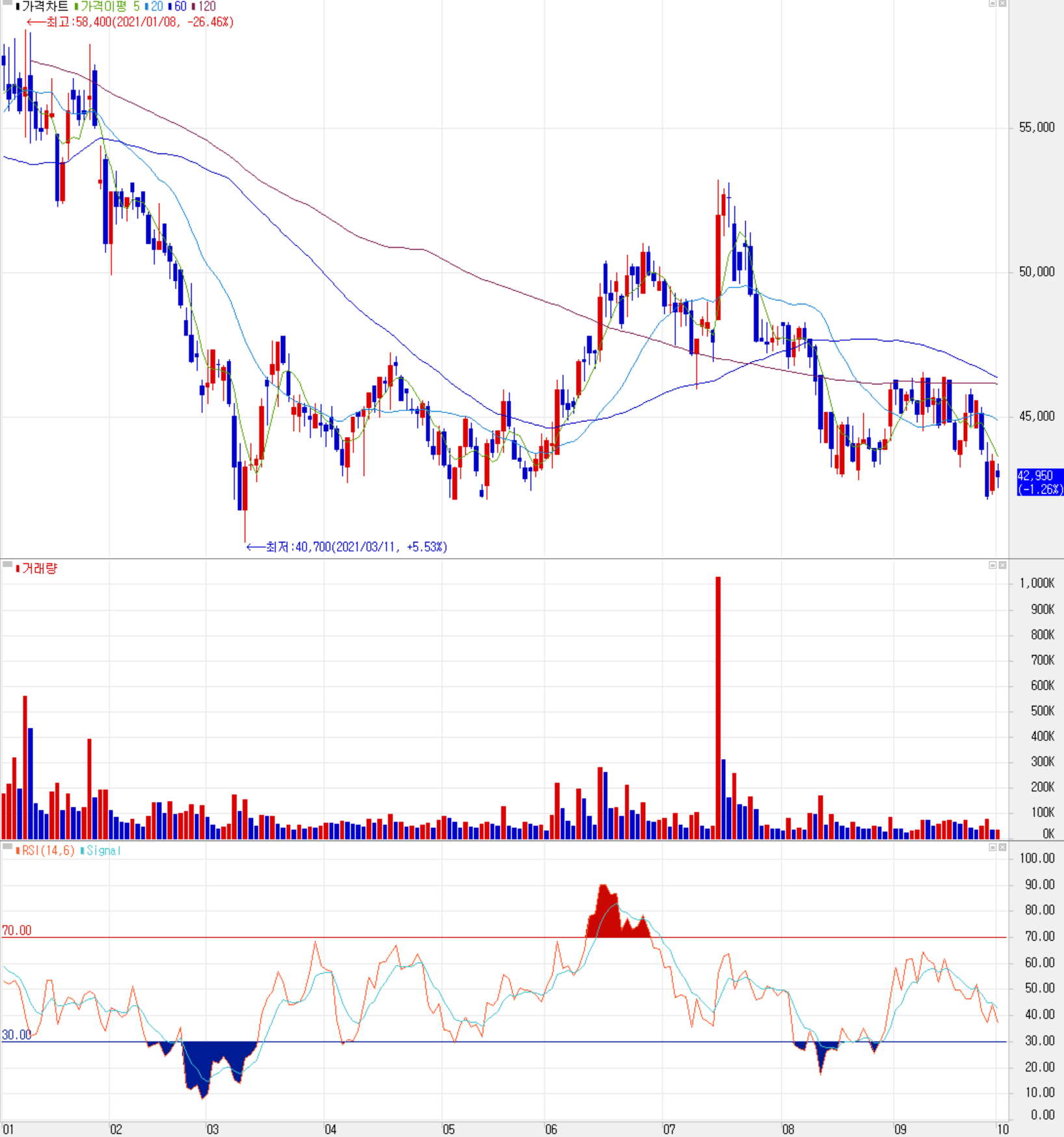 10월 1일 장 종료 기준 당사의 주가는 전일보다 1.26% 내린 42,950원에 거래를 마감했습니다. 외국인 비중은 3.39%이며, 시가 총액 9,931억 원으로 코스닥 시총 기준 66위 종목입니다.