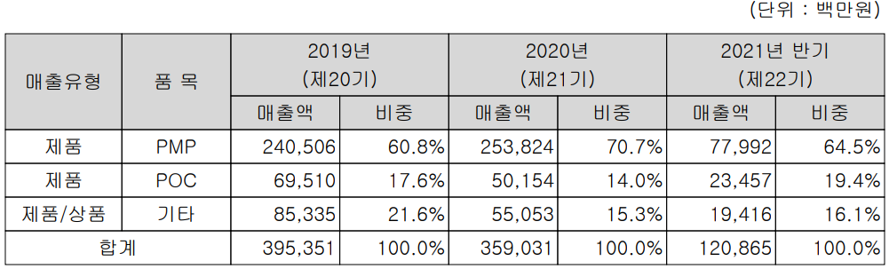 당사는 반도체 융복합 기술 기반의 2차전지 보호회로 제품인 PMP(Protection Module Package) 및 POC(ProtectionOne Chip)을 주력으로 생산하면서 배터리 팩, 디지털 센서 등의 사업을 진행하고 있습니다. 지난 상반기 주력 제품인 PMP의 매출은 780억 원으로 전체 매출의 64.5%를 차지하였으며, POC는 235억 원으로 19.4%의 매출 비중을 기록했습니다.