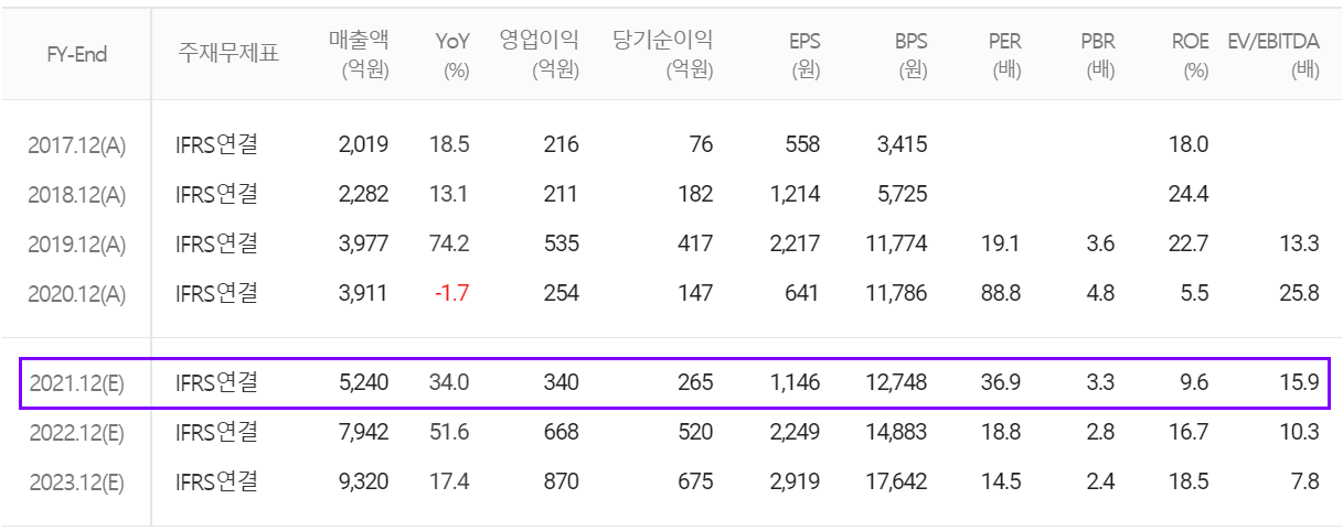 2021년 연간 예상실적은 매출액 5,240억 원으로 전년 대비 34% 증가하고, 영업이익은 340억 원으로 북미향 모바일 부품의 공급의 본격화, 웨어러블용 부품 생산, 자동차 전장 등에서 가시적인 매출이 나올 것으로 전망하고 있습니다.