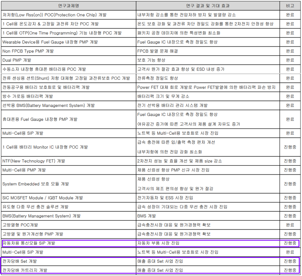당사는 지난 상반기 매출액의 4.62%인 56억 원 규모의 비용을 투입하면서 2차전지 보호회로의 성능 개선 및 신제품 개발, 전자담배 그리고 자동차 전장 시장에 진출할 예정입니다.