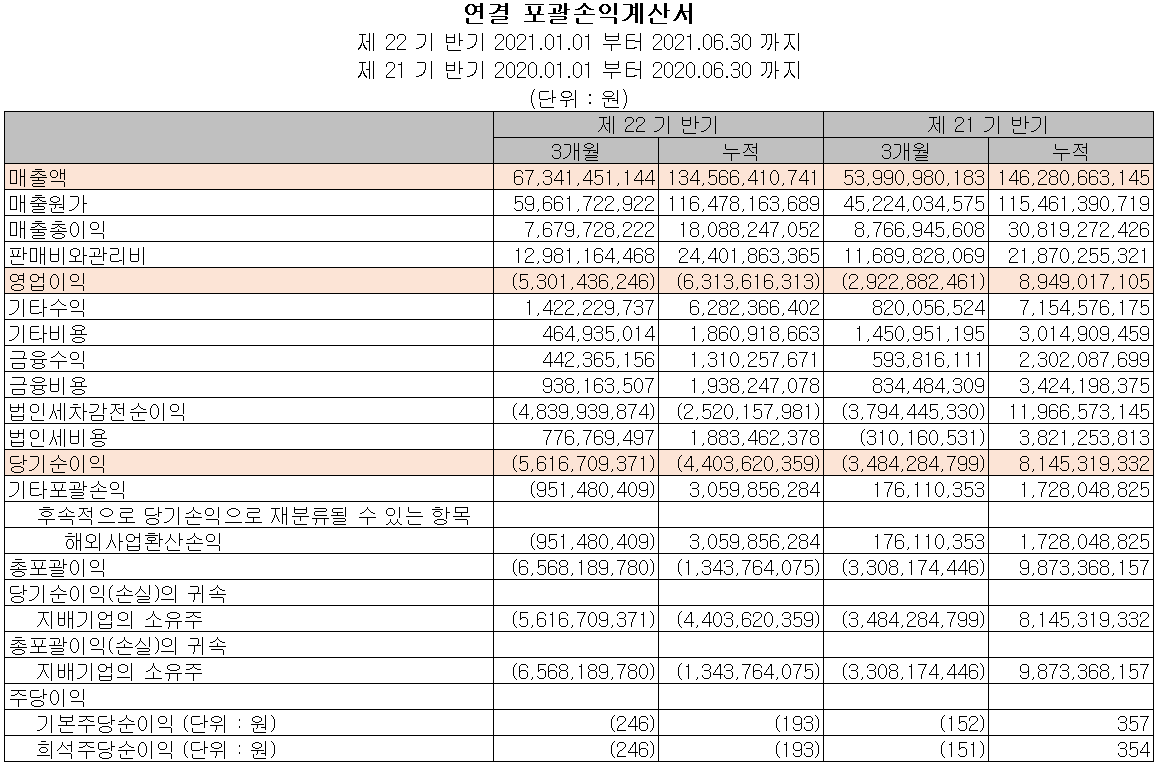 2021년 2분기 당사의 실적은 매출액 673억 원으로 전년 동기 대비 24.7% 증가했으나, 영업손실 53억 원, 당기순손실 56억 원으로 적자 지속입니다. 주로 제품 믹스 이슈 및 제품 단가 압박 등으로 인한 적자가 지속되는 상황입니다.