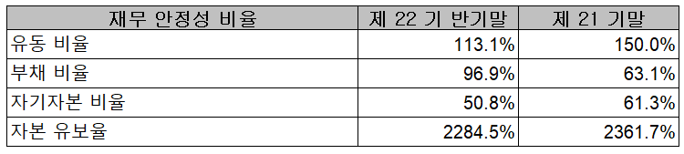 2021년 상반기 말 기준 재무안정성 비율에서는 유동비율 113.1%, 부채비율 96.9%, 자기자본비율 50.8%, 자본유보율 2,284.5%를 기록했습니다. 장단기 차입금이 전기 말 대비 약 700억 원 늘어나면서 당기 부채를 상환하고, 종속회사 아이티엠반도체 베트남에 2021년 신규 양산 예정 제품에 대한 생산능력 확보를 위한 설비 투자 및 2022년 신규 양산 예정 제품의 생산공간 확보를 위한 공장 신축 등으로 부채 부담이 다소 증가하였습니다.