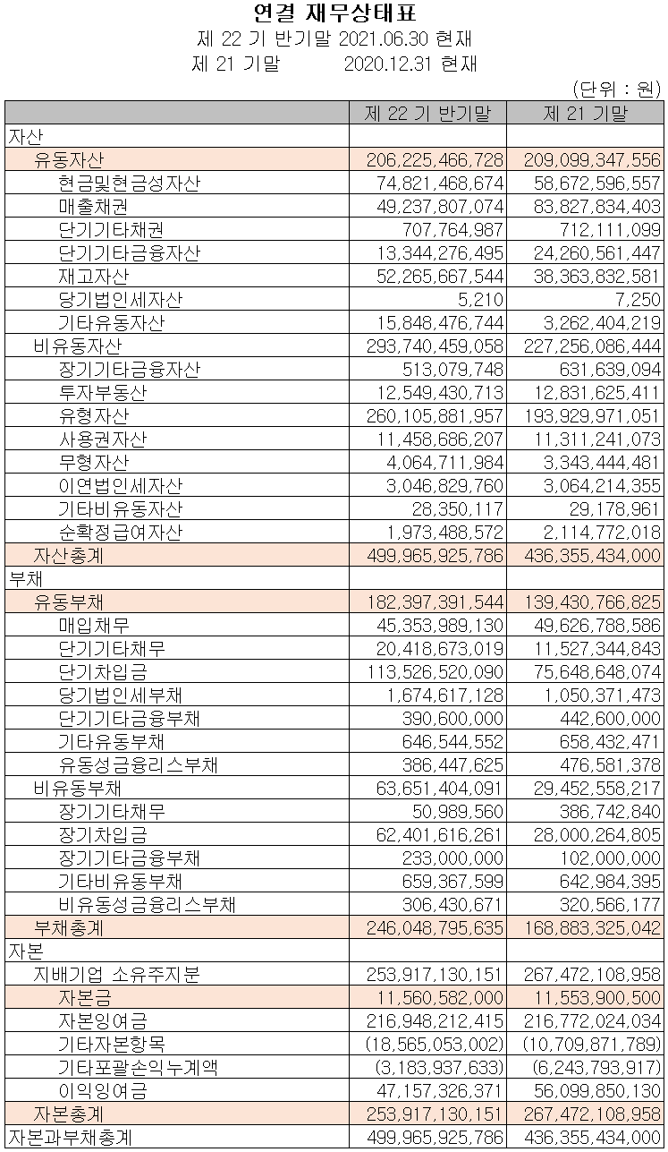지난 상반기 말 현재 자산총계는 전기 말보다 14.6% 늘어난 5,000억 원으로 현금 및 현금성 자산과 유형자산의 증가에 기인합니다. 부채총계는 45.7% 증가한 2,460억 원으로 장단기 차입금의 증가에 따릅니다.