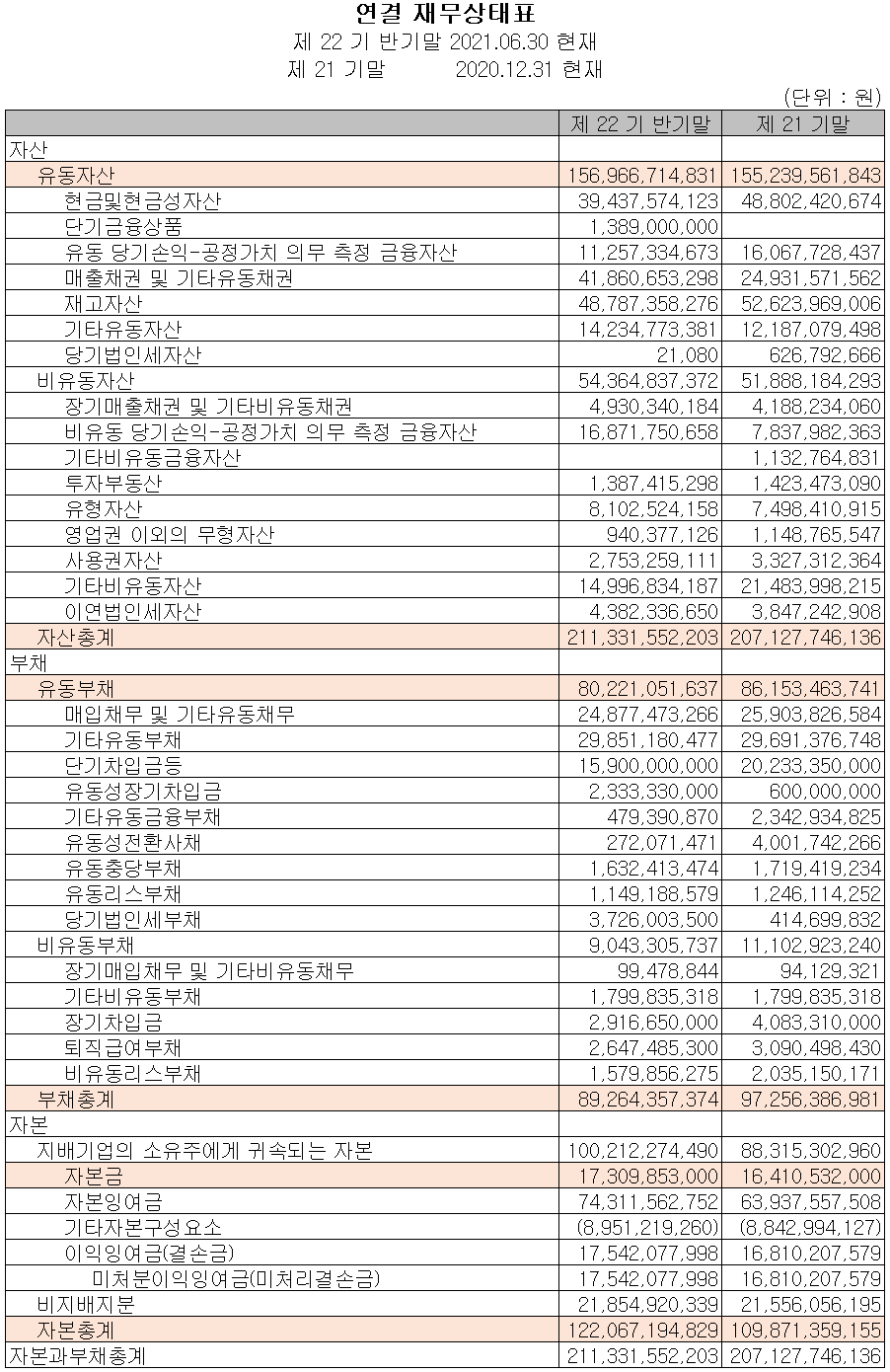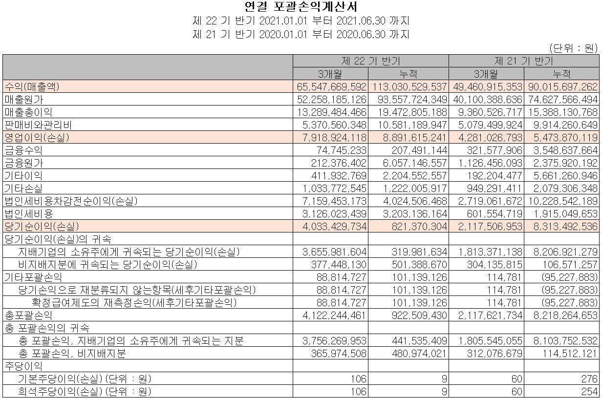 2021년 상반기 말 현재 자산총계는 전기 말보다 2% 증가한 2,113억 원이며, 부채총계는 8.2% 줄어든 892억 원을 기록했습니다. 부채 감소의 주요인은 단기차입금과 유동성 전환사채의 감소에 기인합니다.