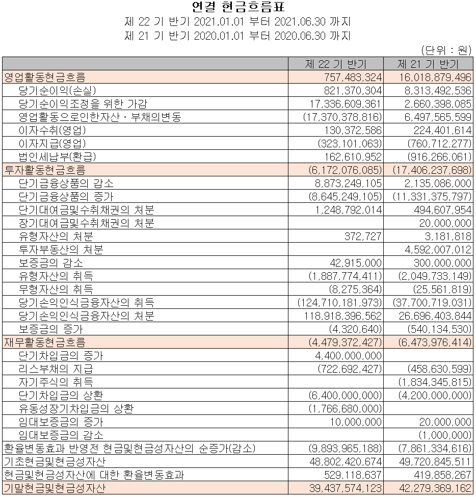 2021년 상반기 영업활동 현금흐름에서는 7.5억 원의 현금이 유입되었으며, 투자활동에서는유무형 자산 및 당기손익 금융자산(단기자금운용 상품 및 비상장주식)의 취득으로 62억 원의 현금이 유출되었습니다. 재무활동에서는 차입금을 조달하였고, 당기 부채를 상환하였습니다. 2021년 상반기 말 기준 현금 및 현금성 자산은 전년 동기 말보다 28억 원이 감소한 394억 원을 보유하고 있습니다.