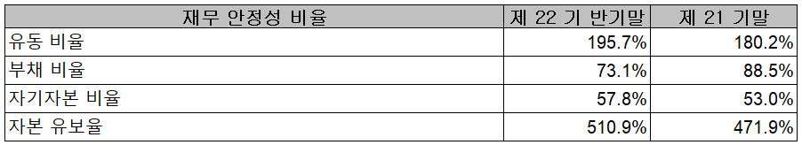 2021년 상반기 말 기준 재무안정성 비율에서는 유동비율 195.7%, 부채비율 73.1%, 자기자본비율 57.8%, 자본유보율 530.6%를 기록하면서 전반적으로 양호한 재무상태를 유지하고 있습니다.