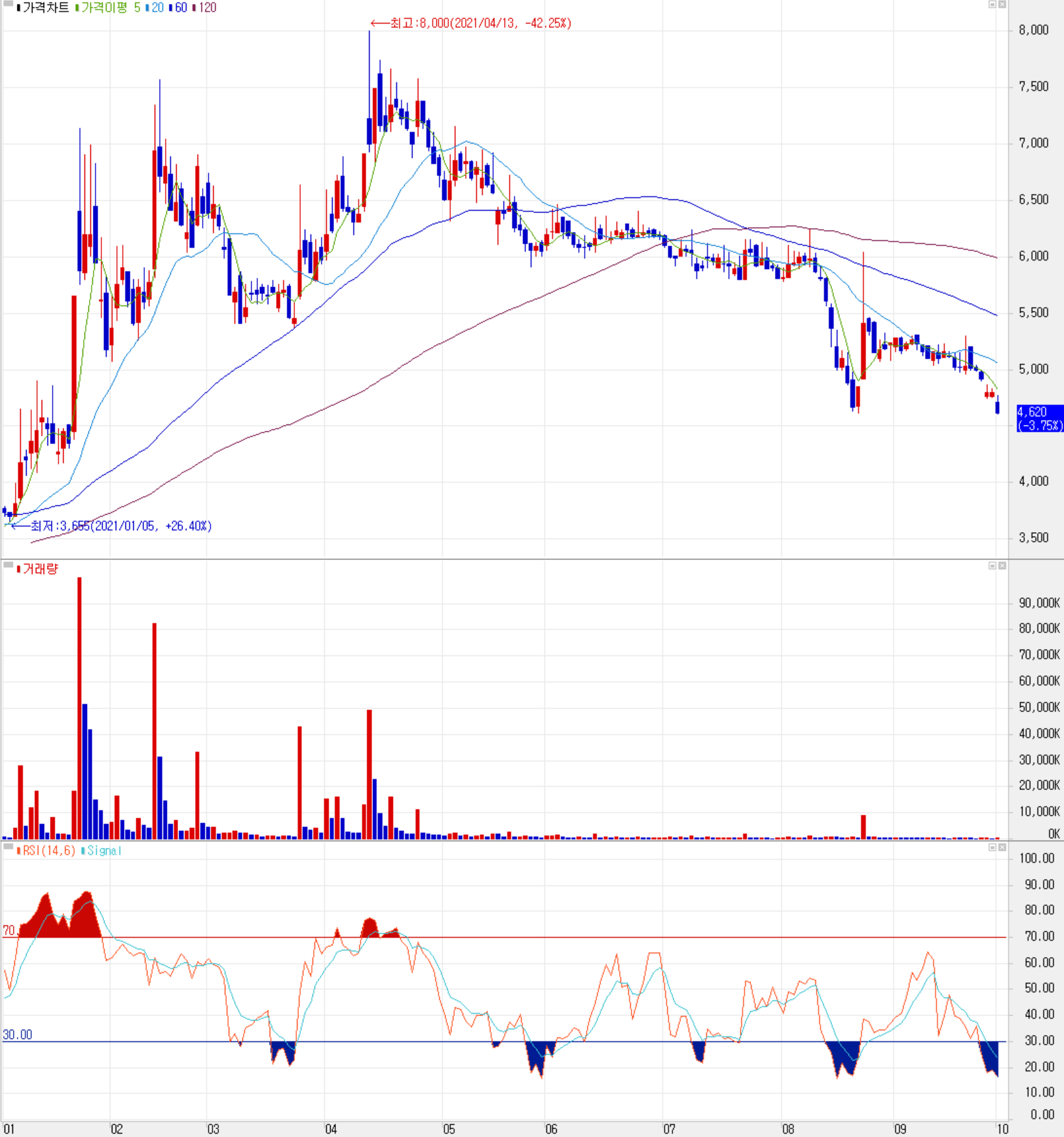 10월 1일 장 종료 기준 당사의 주가는 전일보다 3.75% 내린 4,620원에 거래를 마감했습니다. 시가총액 1,591억 원으로 코스닥 시총 기준 623위 종목입니다.