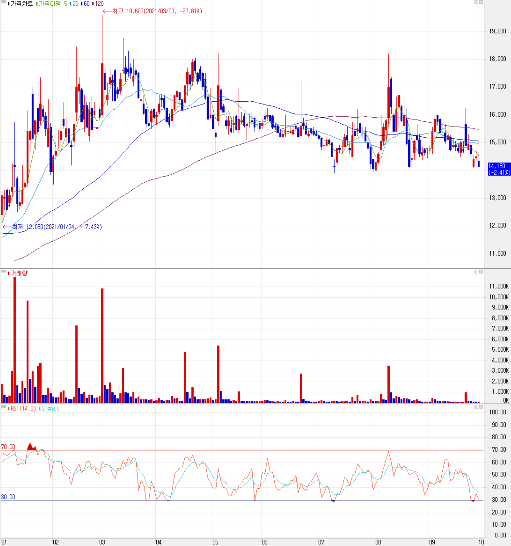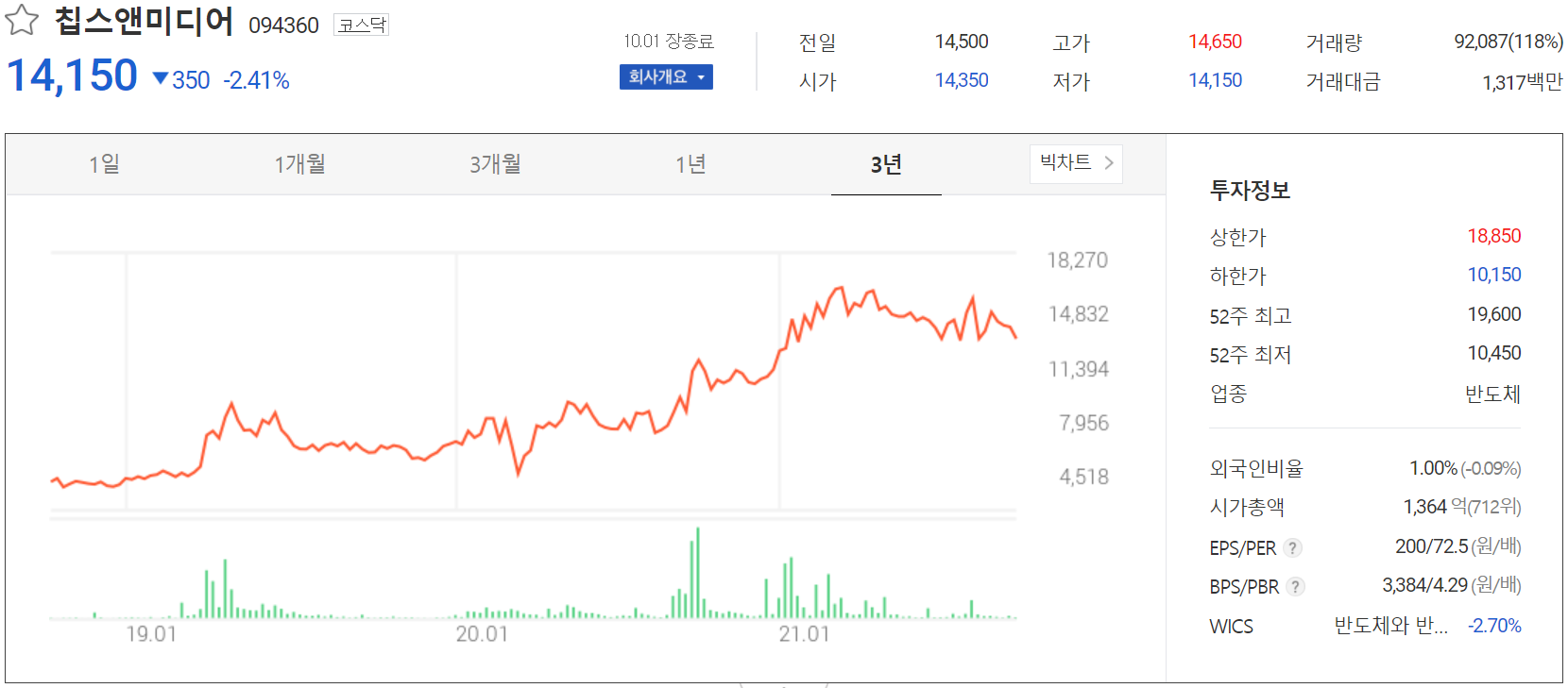 10월 1일 장 종료 기준 당사의 주가는 전일보다 2.41% 내린 14,150원에 거래를 마감했습니다. 외국인 비율은 1%이며, 시가 총액은 1,364억 원으로 코스닥 시총 기준 712위 종목입니다.