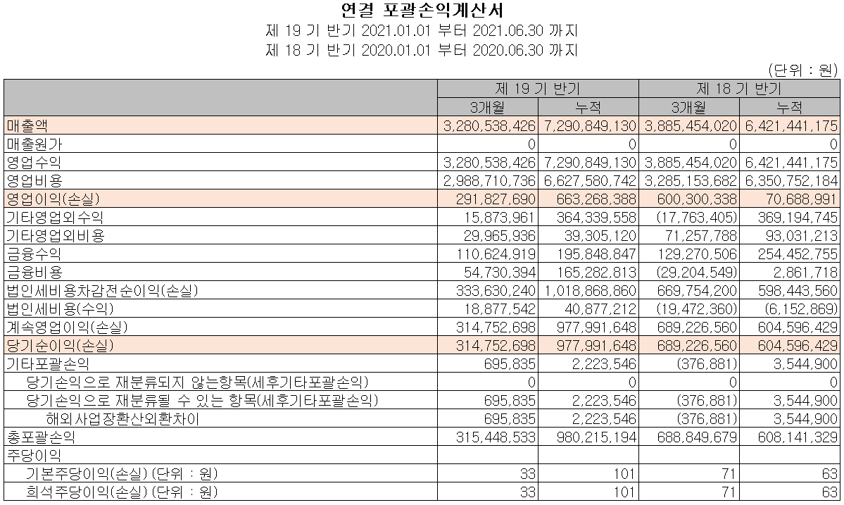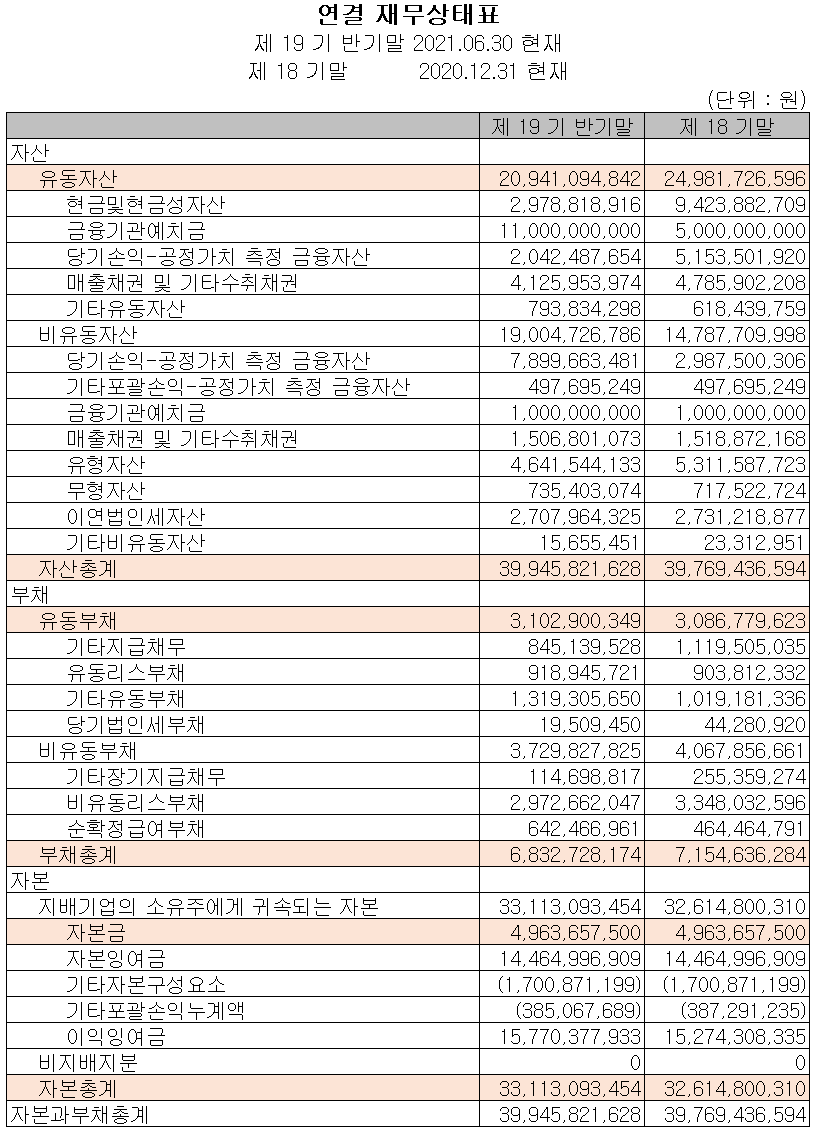 2021년 상반기 말 현재 자산총계는 전기 말보다 0.4% 늘어난 399억 원이며, 부채총계는 지급채무 및 리스부채 등이 줄어들면서 4.5% 감소한 68억 원을 기록했습니다.