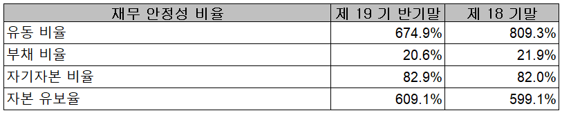 2021년 상반기 말 기준 재무안정성 비율에서는 유동비율 674.9%, 부채비율 20.6%, 자기자본비율 82.9%, 자본유보율 609.1%를 기록하면서 전반적으로 양호한 재무상태를 유지하고 있습니다.