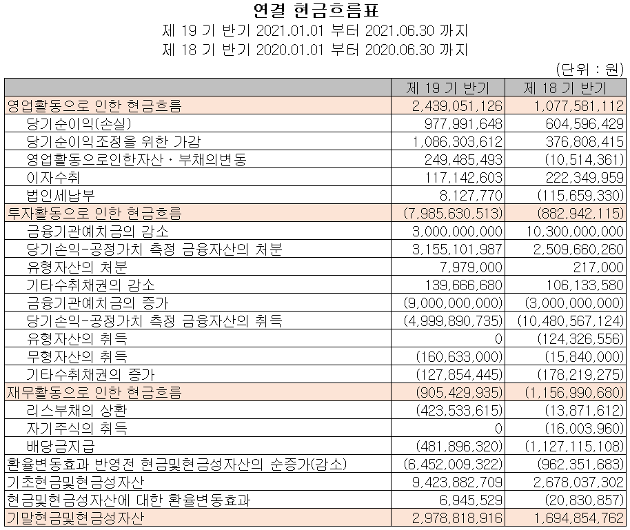 2021년 상반기 영업활동 현금흐름에서는 24억 원의 현금이 유입되었으며, 투자활동에서는 금융기관 예치금의 증가와 무형자산의 취득으로 80억 원의 현금이 유출되었습니다. 재무활동에서는 당기 부채를 상환하고, 배당금을 지급하면서 9억 원의 현금이 유출되었습니다. 2021년 6월 30일 기준 현금 및 현금성 자산은 전년 동기 말보다 13억 원이 증가한 30억 원을 보유하고 있습니다.