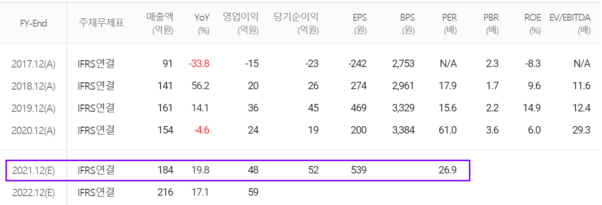 2021년 연간 예상실적에서는 매출액 184억 원으로 전년 대비 19.8% 증가하고, 영업이익은 48억 원으로 100% 증가할 것으로 추정했습니다. 상반기 로열티 적용 칩의 개수가 급증하면서 꾸준한 매출 신장이 예상되고, 2분기 지연된 미국 라이선스 계약 체결 및 중국 기업의 라이선스 매출도 꾸준할 것으로 전망하고 있습니다.