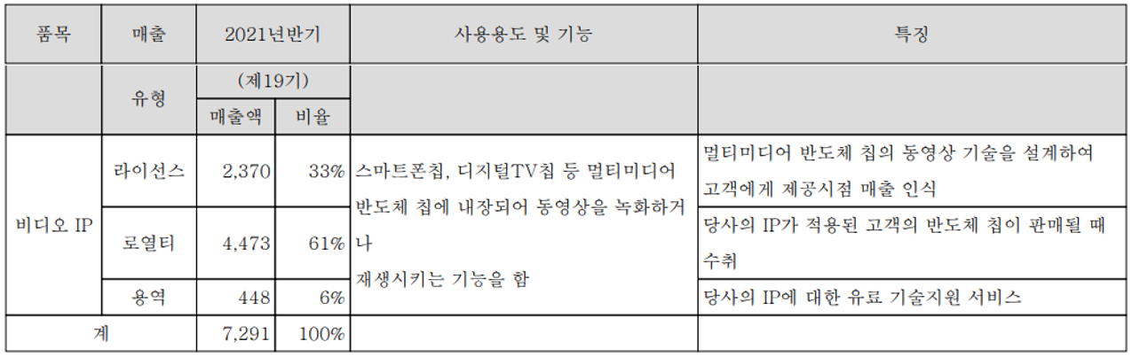 당사는 비디오 IP의 라이선스 및 로열티를 주력으로 영위하고 있으며, 지난 상반기 라이선스 매출액은 24억 원으로 전체 매출의 33%이며, 로열티 판매는 45억 원으로 61%의 매출 비중을 나타냈습니다.
