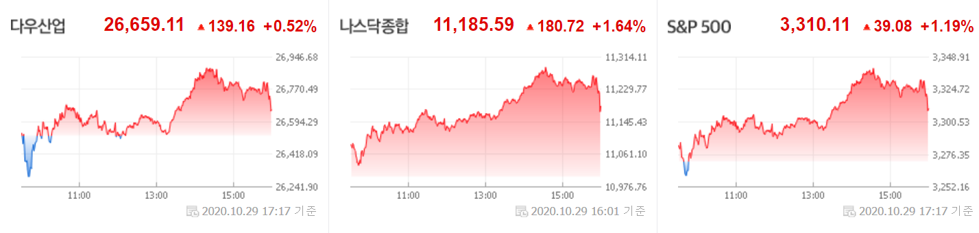 지난 밤 뉴욕 증시는 미국의 3분기 경제성장률(GDP) 전분기 대비 33.1% 성장, 실업수당 청구 건수 감소 및 코로나19 백신 및 치료제에 대한 기대감에 따라 반등에 성공한 모습입니다. 하지만 미국 대선이 점점 다가오면서 커지는 불확실 성, 장 후에 나온 미국과 유럽의 코로나19 확진자 급증 등이 10월 30일 장세를 어둡게 합니다.