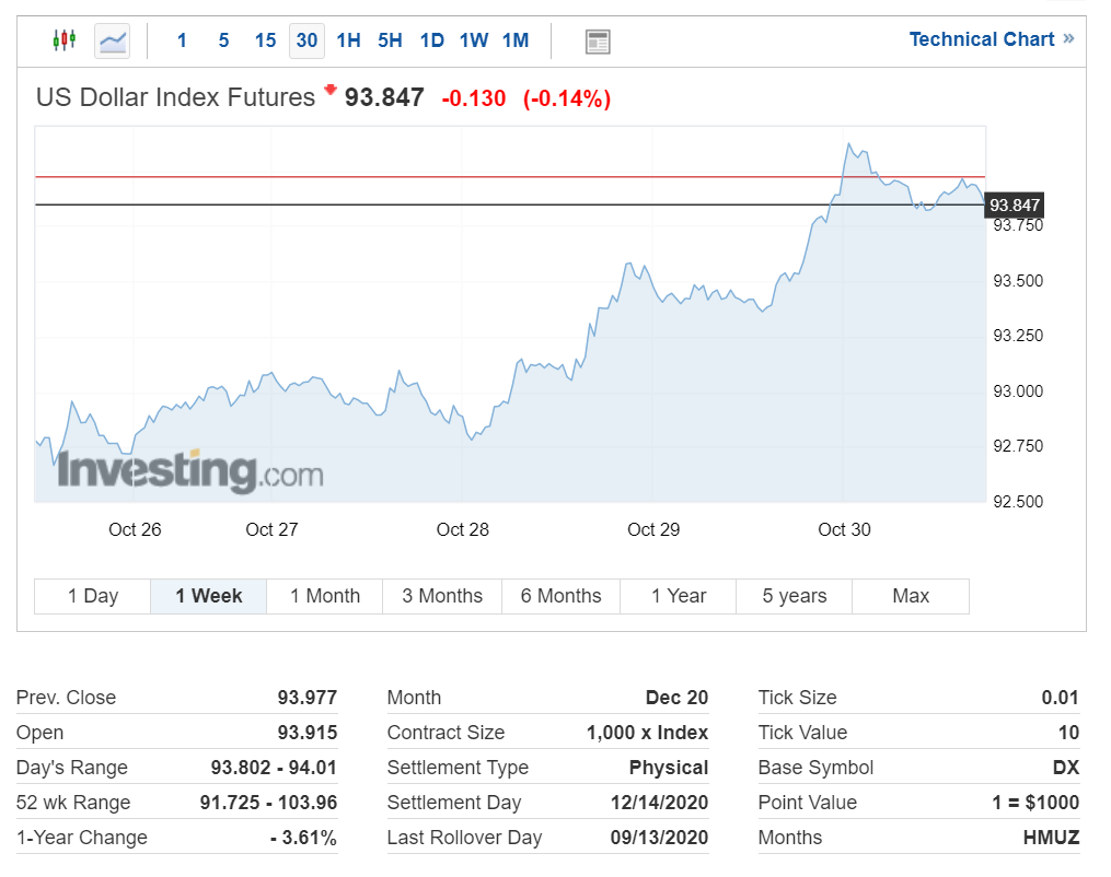 미국 달러 인덱스 선물은 현재 93.847에 거래중이며 최근 상승 추세를 보이고 있습니다.