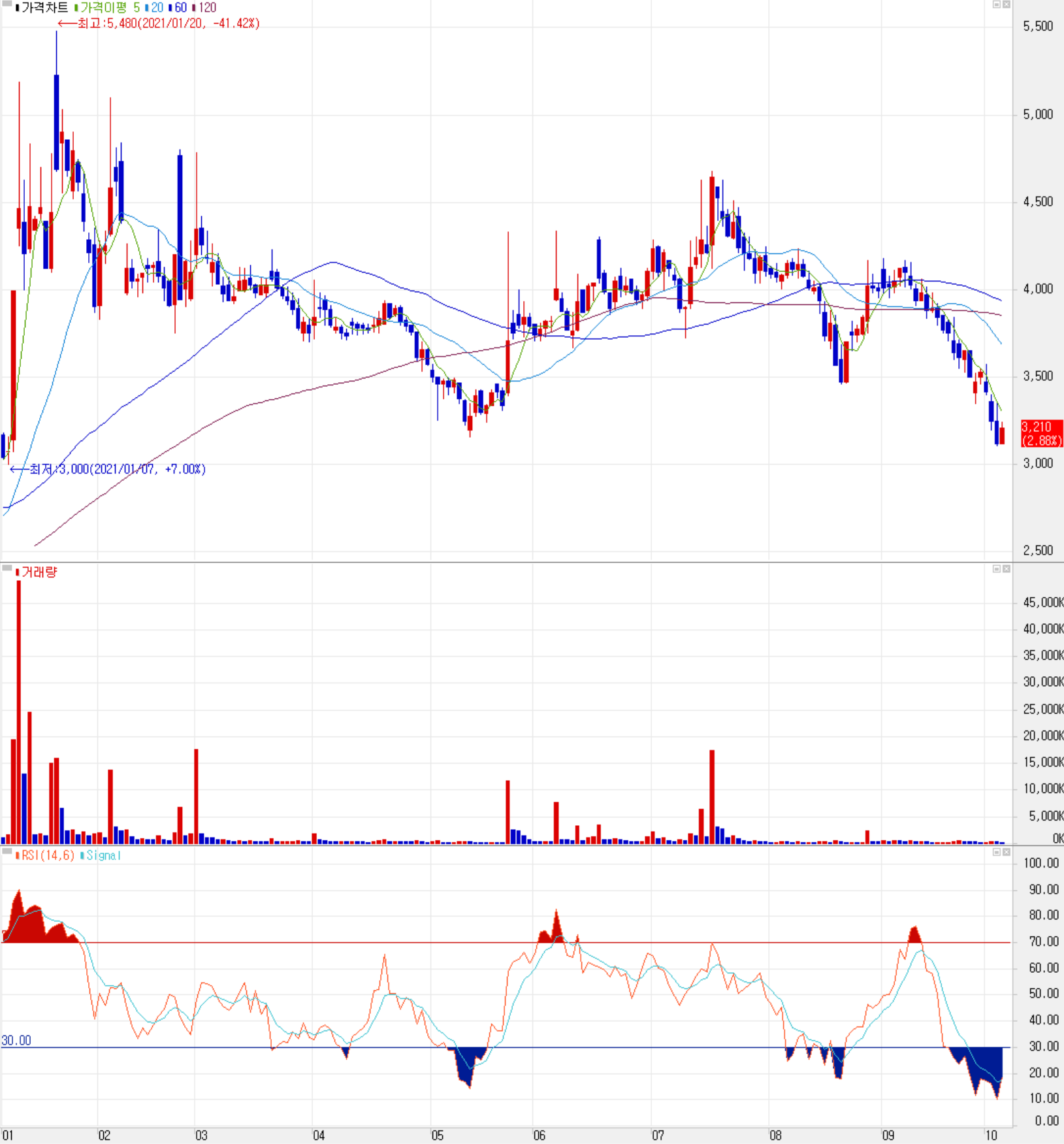 당사의 주가는 지난 8월 초 4,235원을 기록한 이후 최근까지 꾸준한 하락세를 보이면서 3천원대 초반까지 내려갔으나, 10월 7일 소폭 반등하면서 최근 미국 인플레이션 이슈, 채권 금리 인상, 환율 그리고 중국 헝다 이슈까지 최근 시장의 모습에 따른 변동성을 보이고 있습니다. 오늘 소폭 달러 약세로 마무리된 환율에 외국인의 매수세가 크게 들어왔는데, 개인적인 목표주가는 4,500원으로 그대로 유지하겠으나 당분간은 미국 채권 금리와 원달러 환율 등에 주가 변동성이 있을 것으로 예상됩니다.