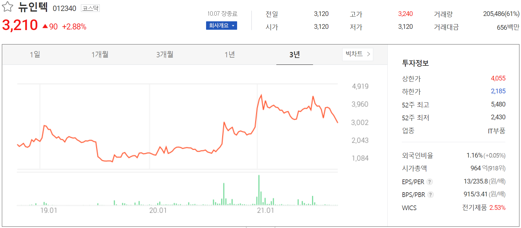 10월 7일 장 종료 기준 당사의 주가는 전 거래일보다 2.88% 오른 3,210원에 거래를 마감했습니다. 외국인 비중은 1.16%이며 시가총액은 964억 원으로 코스닥 시총 기준 918위 종목입니다.