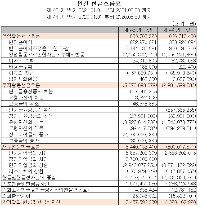 지난 상반기 영업활동 현금흐름에서는 매출채권, 재고자산 등의 증가로 운전자 산은 마이너스 현금흐름을 보였으나 순이익 및 비현금 항목의 조정에 따라 총 7억 원의 현금이 유입되었습니다. 투자활동에서는 유무형자산의 취득과 장기 대여금의 증가 등으로 인해 57억 원의 현금이 유출되었습니다. 재무활동에서는 차입금을 조달하여 당기 부채를 상환하였습니다. 2021년 상반기 말 기준 현금성 자산은 전기 말보다 9억 워니 줄어든 35억 원을 보유하고 있습니다.