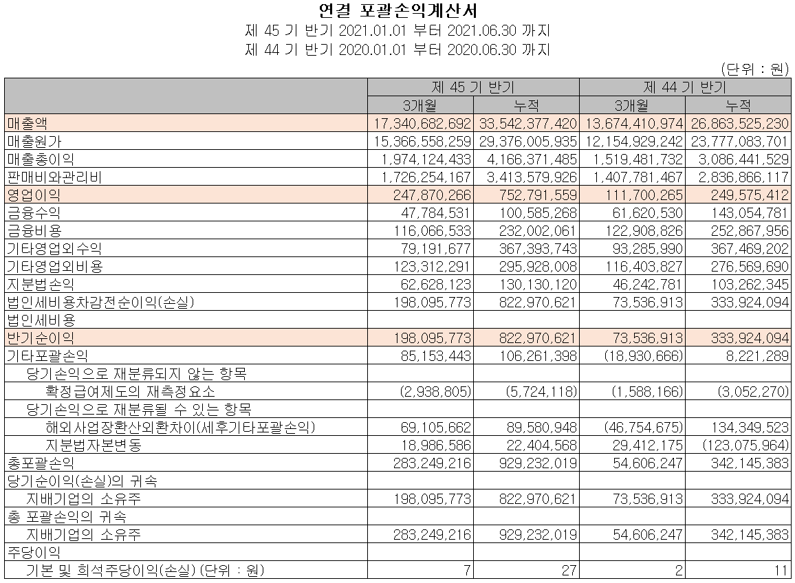 지난 상반기 말 현재 자산총계는 전기 말보다 16.8% 늘어난 611억 원으로 매출채권, 재고자산 및 유형자산의 증가에 기인합니다. 부채총계는 31.8%가 늘어나면서 326억 원으로 단기차입금 및 장기차입금의 증가에 따릅니다.