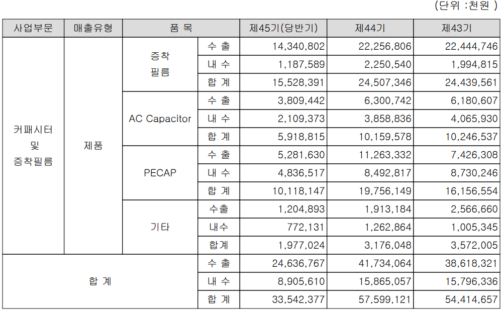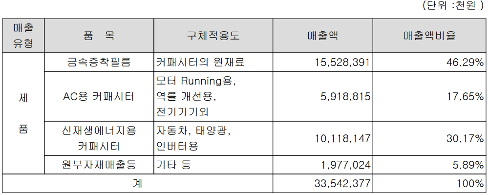 당사는 커패시터의 핵심 소재인 금속증착필름 제조 기술로 수소차, 전기차, 태양광 등 신재생에너지용 커패시터와 다양한 전기기기 및 모터 등에 적용되는 AC용 커패시터 등을 제조, 공급하고 있습니다. 지난 상반기 주력 사업인 금속증착필름의 매출은 155억 원으로 전체 매출의 46.29%를 차지하였으며, 신재생에너지용 커패시터는 101억 원의 매출로 30.17%, AC용 커패시터는 59억 원의 매출로 17.65%의 비중을 기록했습니다.